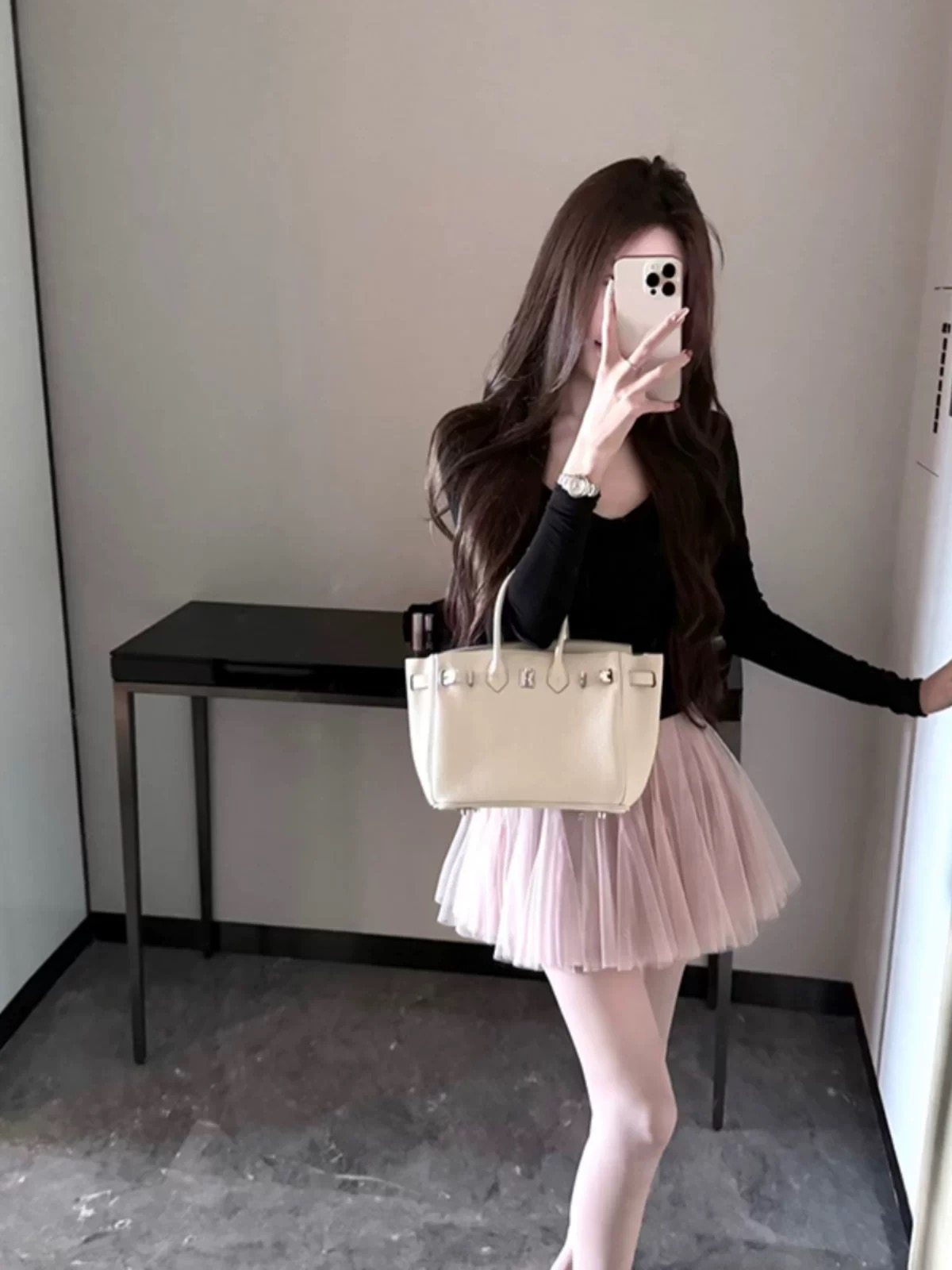韩国订单2025法系叠穿蕾丝短裙 小个子松紧腰蓬蓬粉色网纱tutu裙