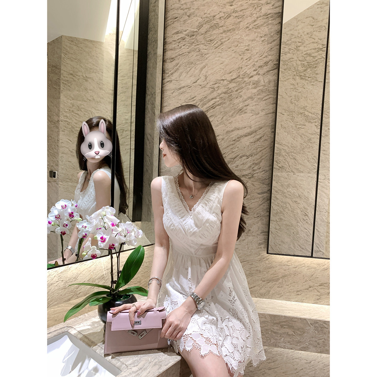 Hotdog 热狗很辣 【雪落蔷薇】白色蕾丝镂空设计感无袖连衣裙短裙