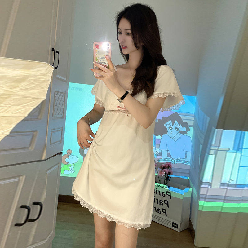 睡衣女夏睡裙网红风夏季2025年新款薄款纯棉蕾丝短裙高级感带胸垫
