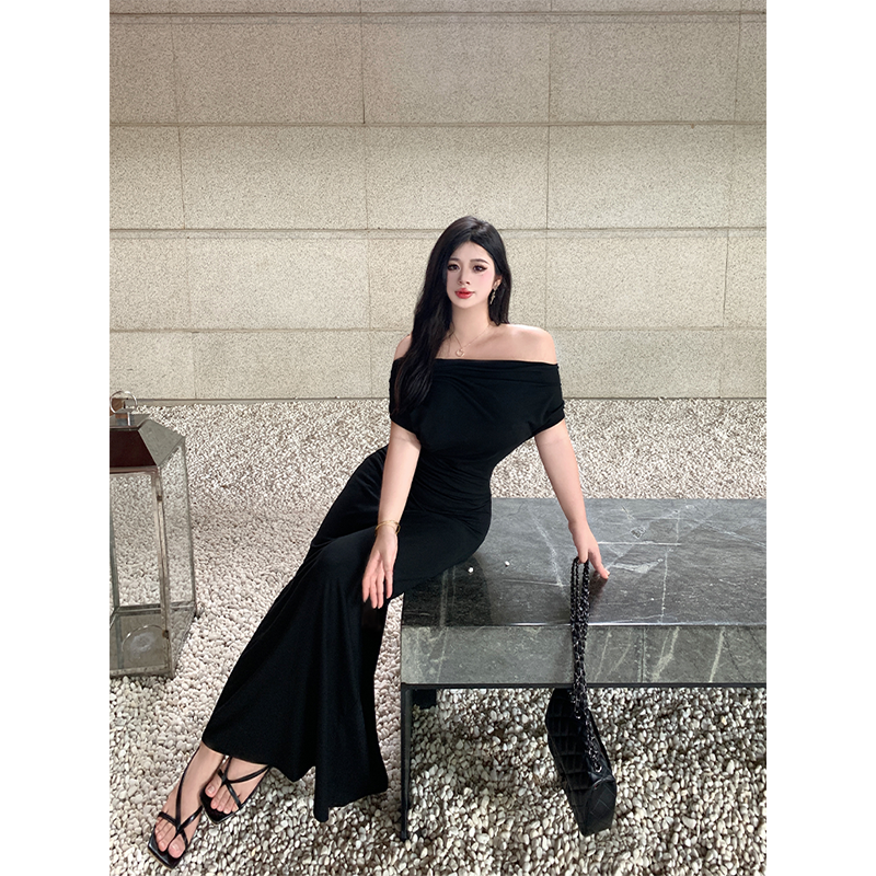2025秋季新款女装复古黑色宽松长袖褶皱雪纺连衣裙露肩一字领长裙