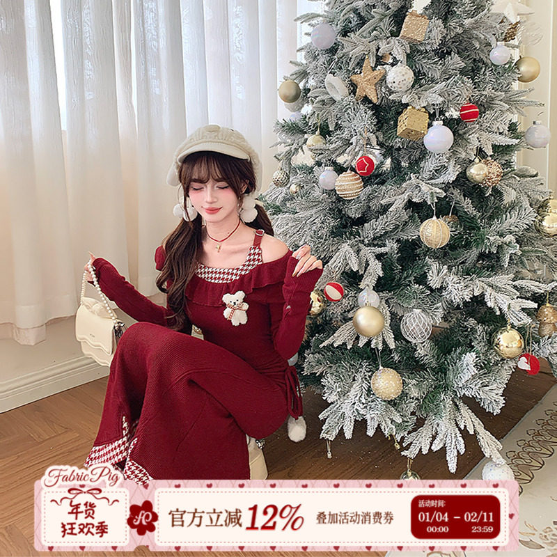 织物猪 圣诞初雪 甜欲风红色连衣裙女冬季新年穿搭露肩针织短裙子