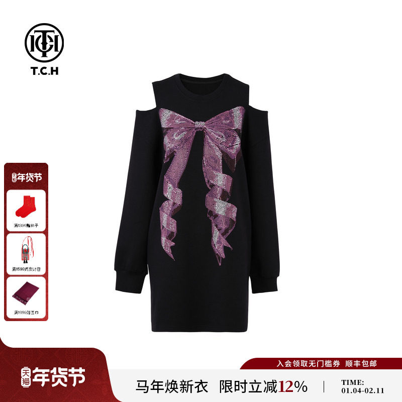 TCH私服25春季新款烫钻蝴蝶结宽松连衣裙露肩卫衣裙女T75A30E5012