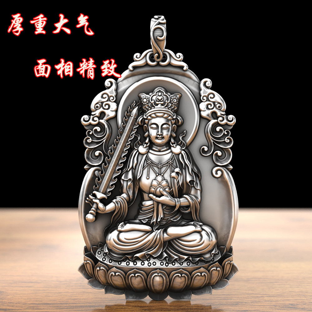 S999足银文殊千手纯银牌实心本命佛男款吊坠守护神属牛虎项链男女