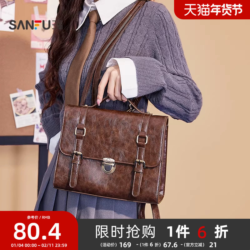 三福背包秋季复古学院英伦风手提翻盖剑桥包双搭扣女包491666