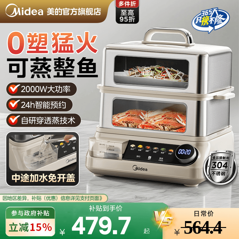美的电蒸锅不锈钢家用多功能三层大容量智能预约电蒸箱一体全自动