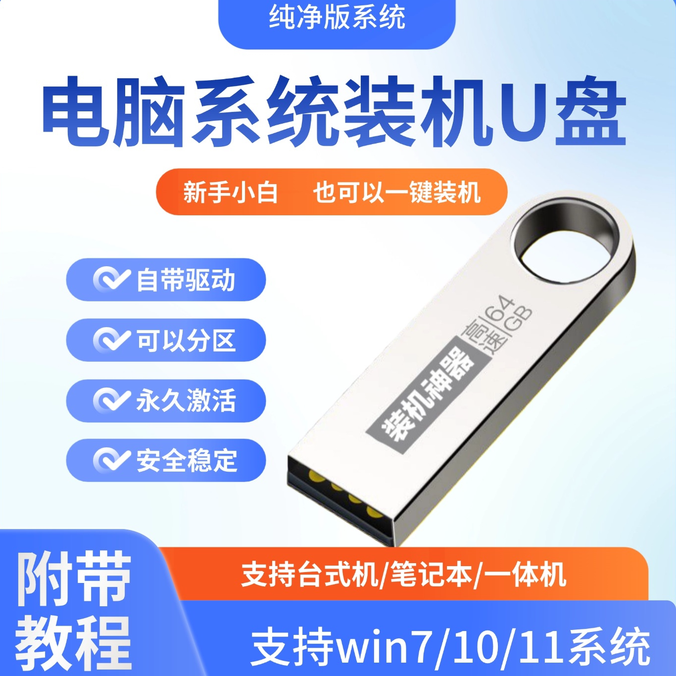 专业纯净系统u盘win10/win11/win7一键装机64G专业版纯净无捆绑