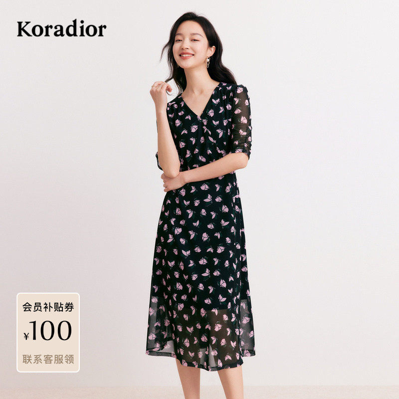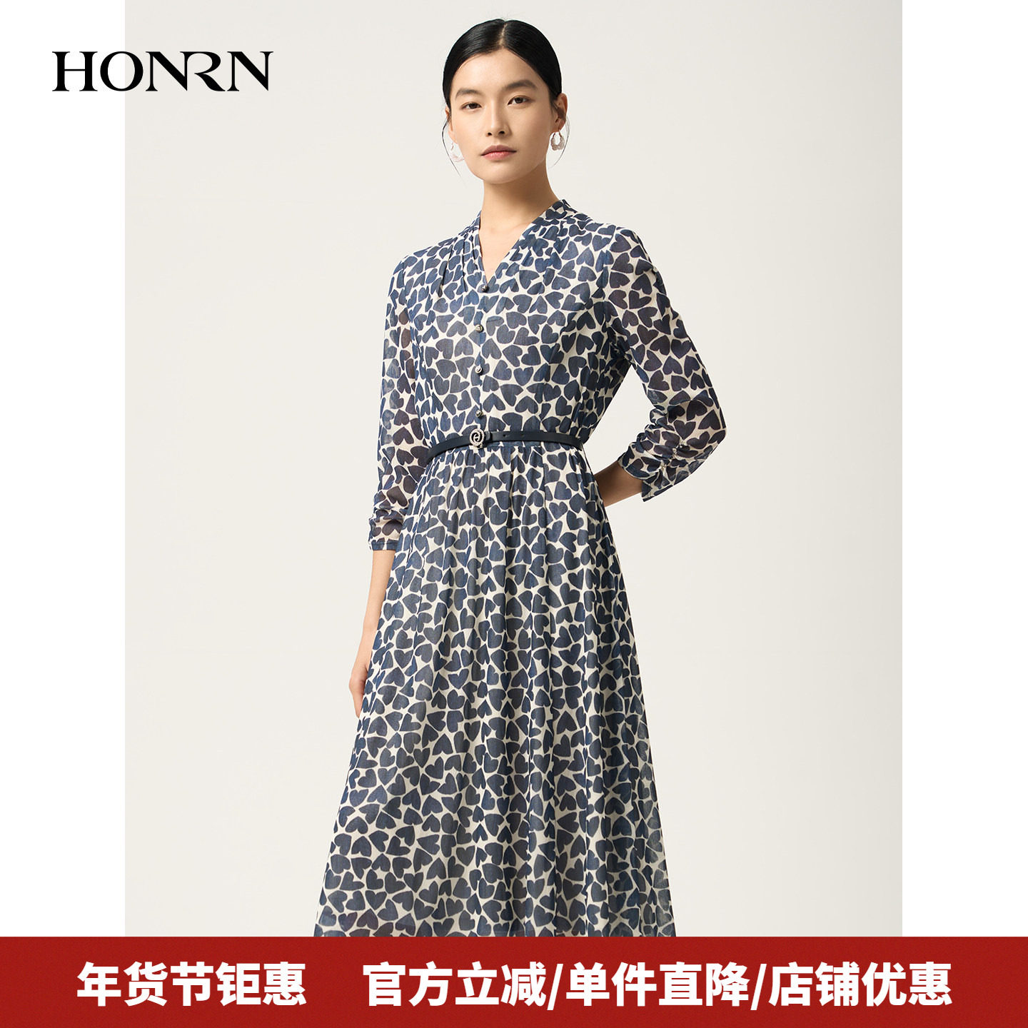 HONRN/红人v领七分袖收腰压褶印花裙子a字连衣裙女春秋HJ11OL076