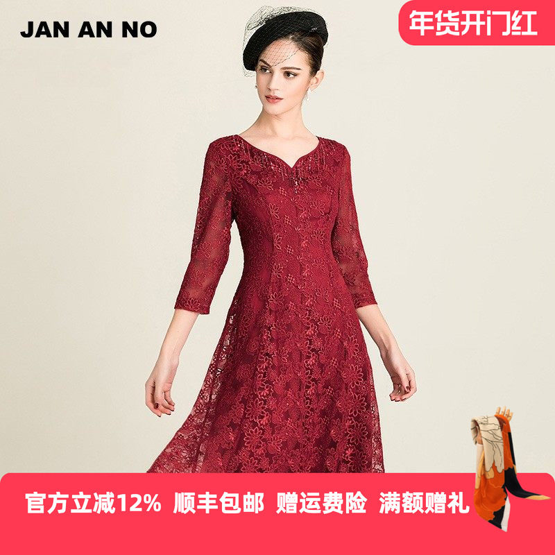 简爱诺春秋中长裙七分袖红色a字收腰散摆气质蕾丝连衣裙J910204LQ