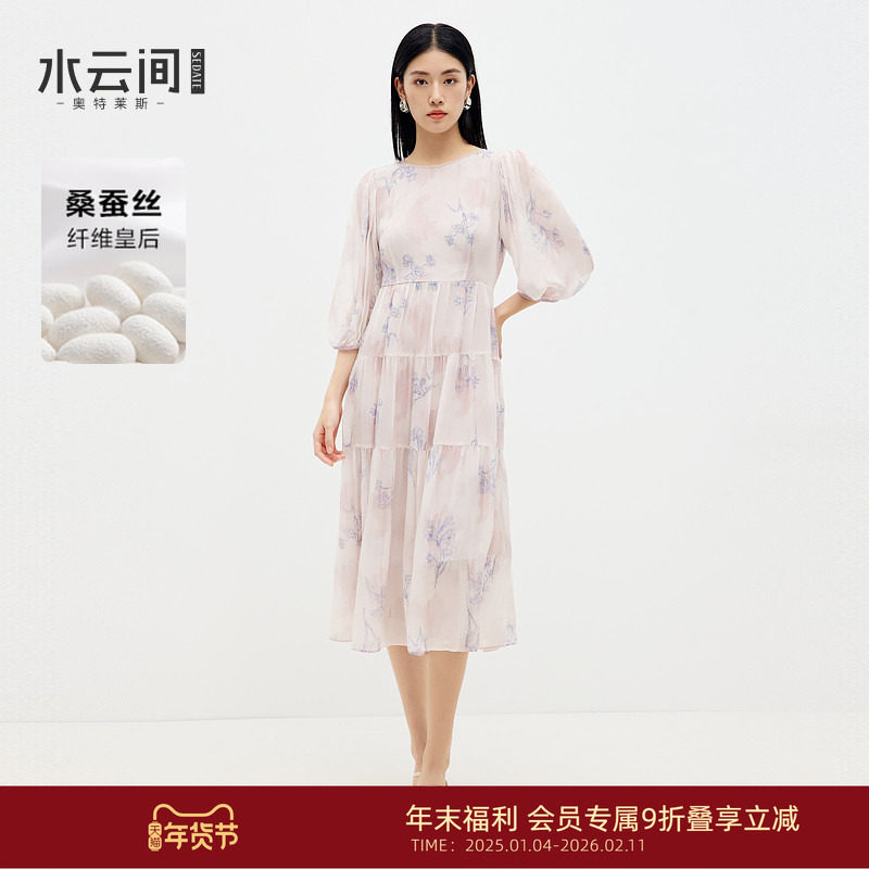 水云间粉色a字连衣裙女七分袖中长裙子夏日田园繁花意趣风2025新