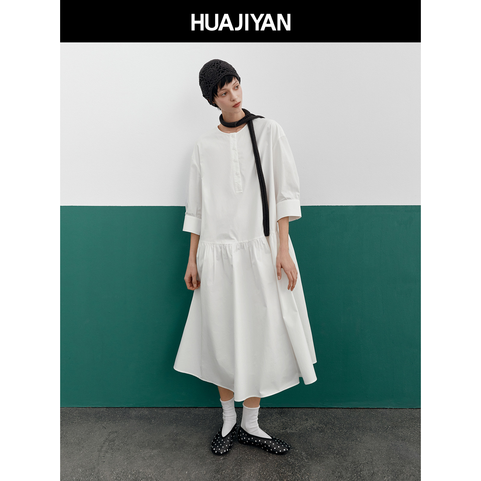 【茉莉】文艺白色A字连衣裙女款2025年夏季七分袖宽松薄款中长裙