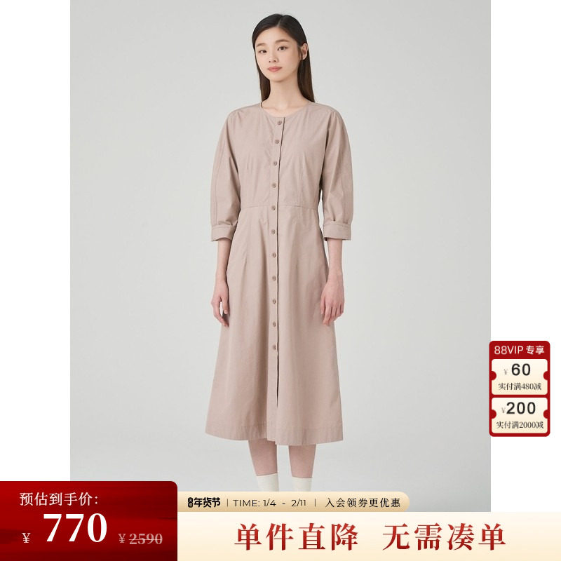 华吉言【月光裙摆】100新疆长绒棉圆领七分袖荷叶边A字连衣裙