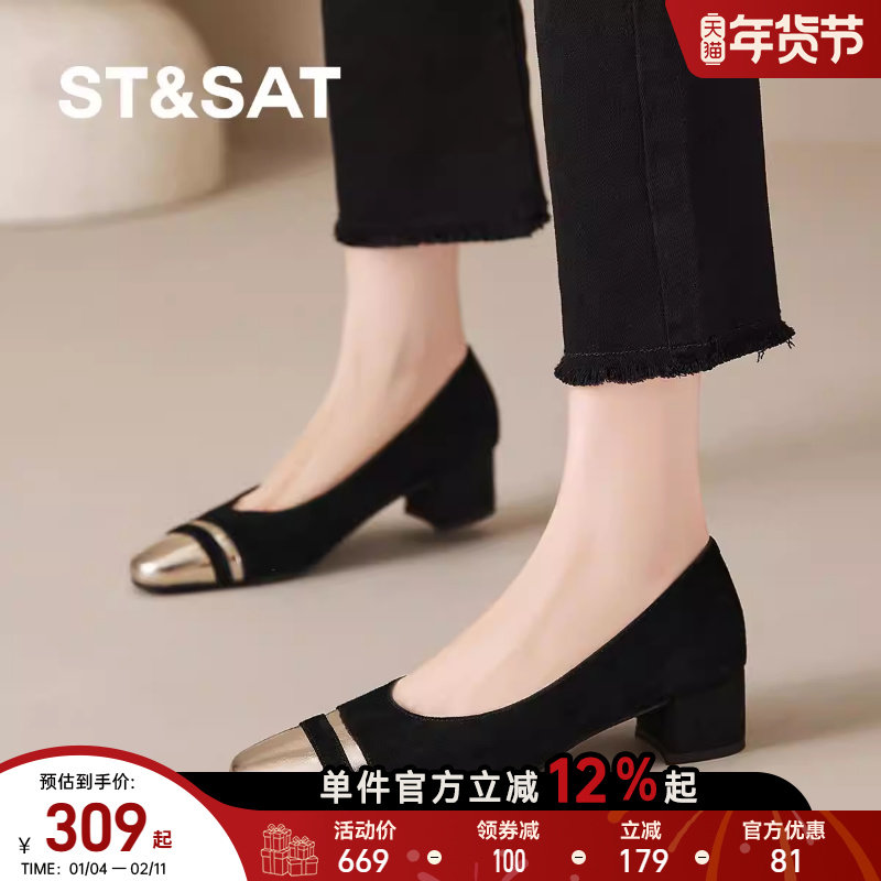 星期六法式尖头绒面百搭复古浅口单鞋女新款粗跟不累脚软底通勤鞋