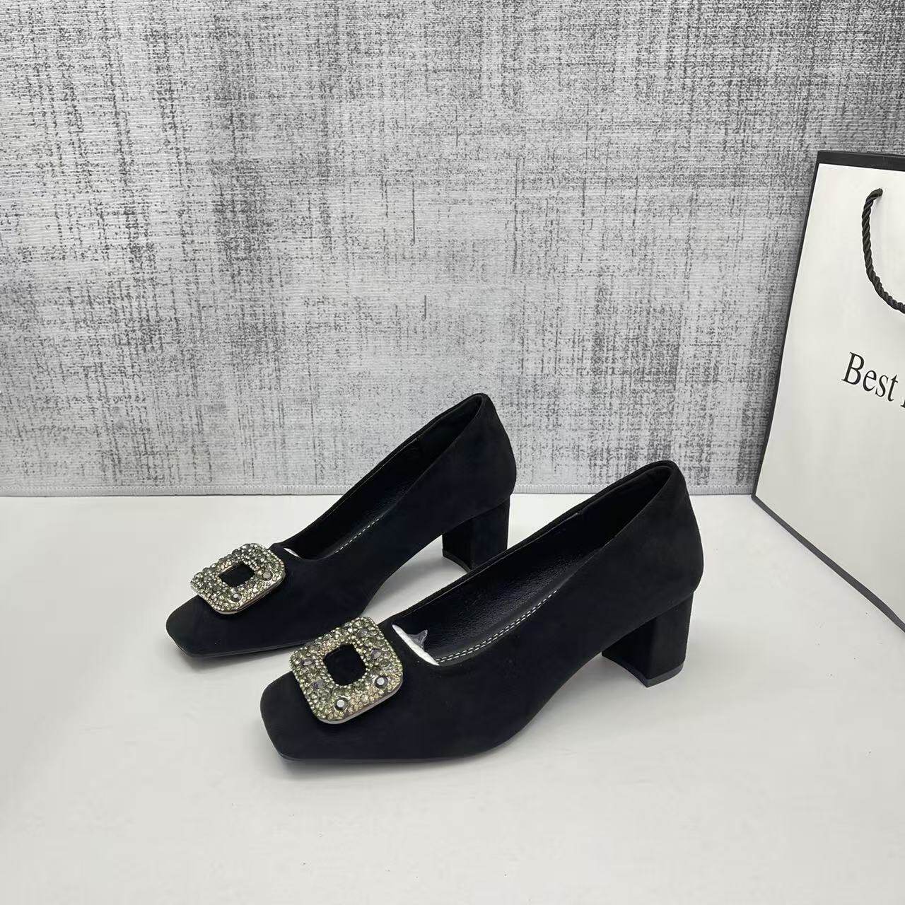 百搭方头浅口粗跟单鞋女2026年春季新款气质水钻方扣绒面高跟鞋子