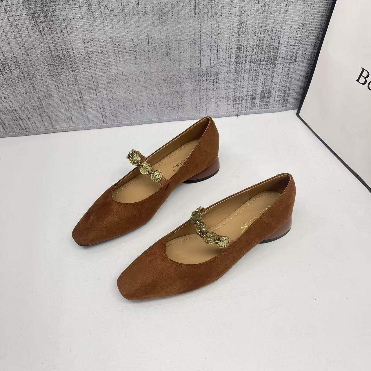 软面方头金币链玛丽珍女2026春秋新款复古法式舒适低粗跟绒面单鞋