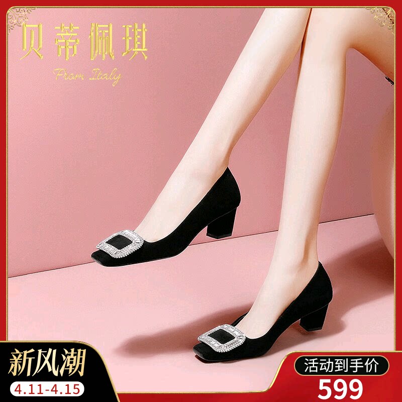 千百度绒面高跟鞋春秋舒适单鞋女通勤粗跟羊皮女鞋浅口晚晚鞋气质