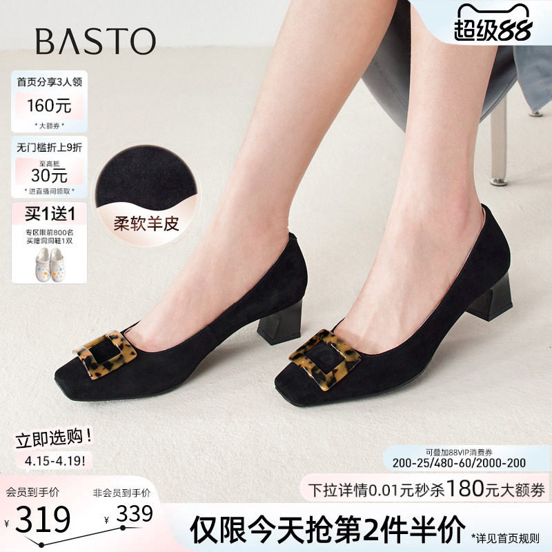 百思图2026春商场新款通勤粗跟方扣绒面浅口女单鞋船鞋R6161AQ6