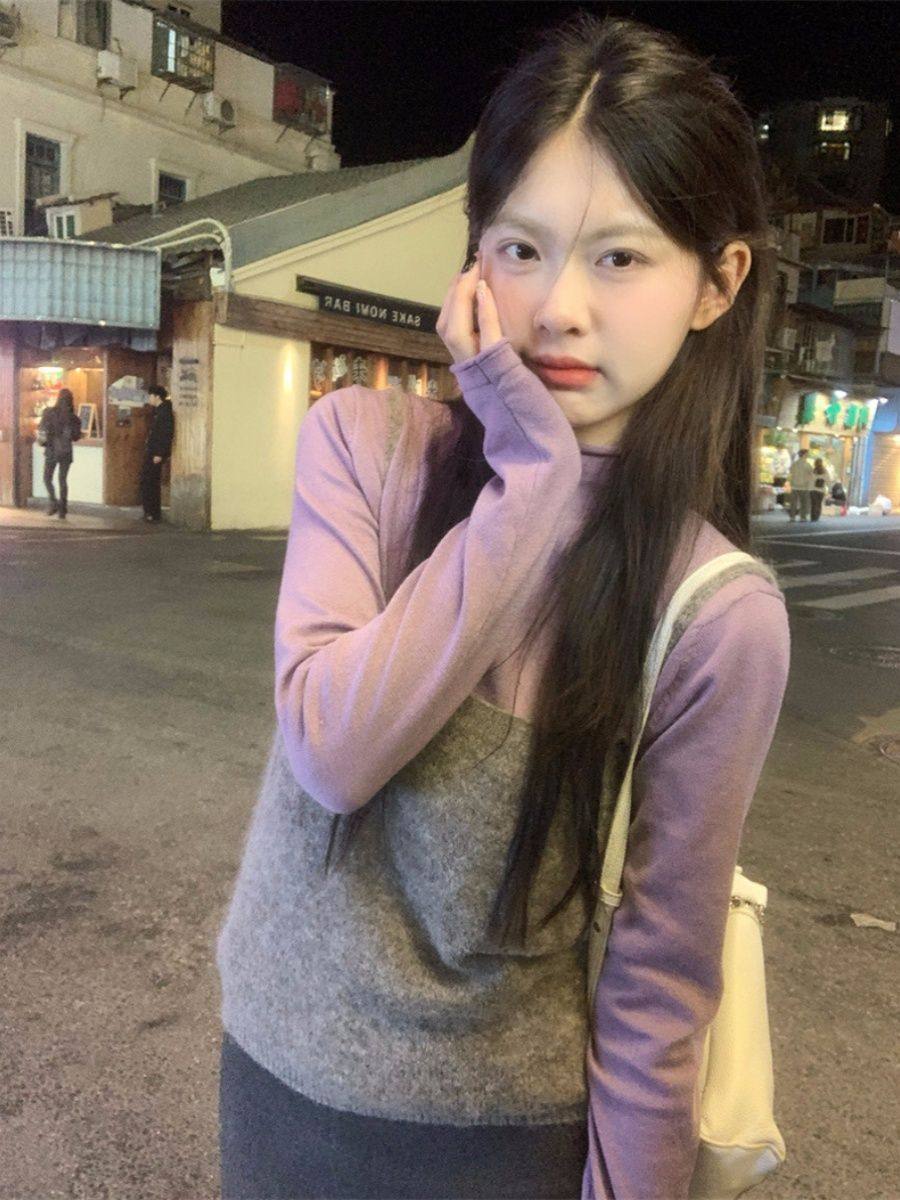 甜美套装女春季减龄叠穿短款针织吊带背心半高领紫色打底衫两件套
