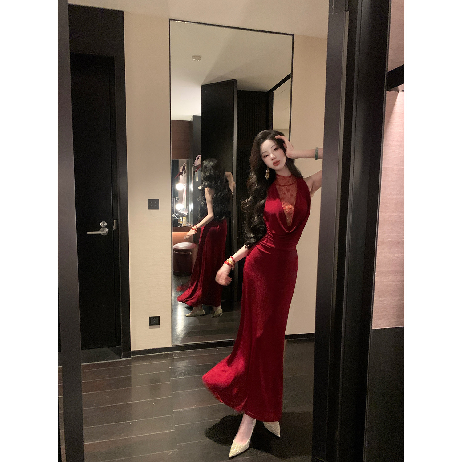 灰尘邓邓 蕾丝拼接挂脖连衣裙女2025冬季新款无袖气质长裙裙子