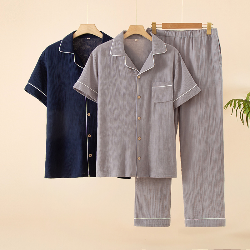 纯棉纱布睡衣男士简约纯色宽松短袖长裤夏季可外穿薄款家居服套装