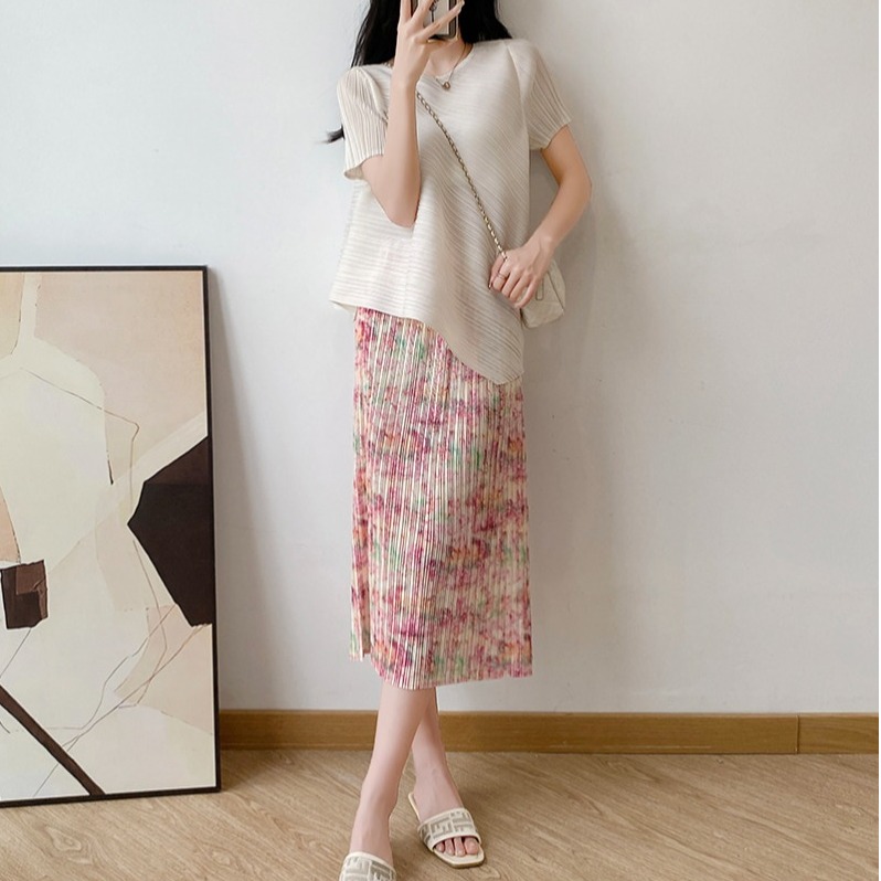 三宅褶皱不规则纯色宽松短袖上衣 姹紫嫣红碎花淑女百褶半裙套装