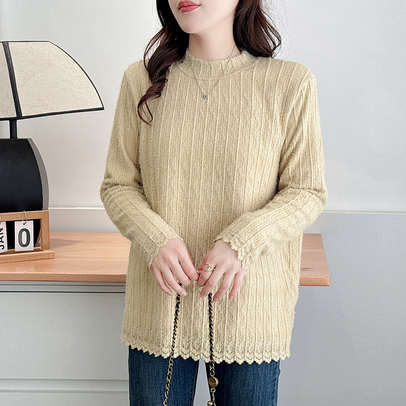 秋冬大码蕾丝拼接半高领打底衫女内搭牙签条德绒t恤百搭长袖上衣