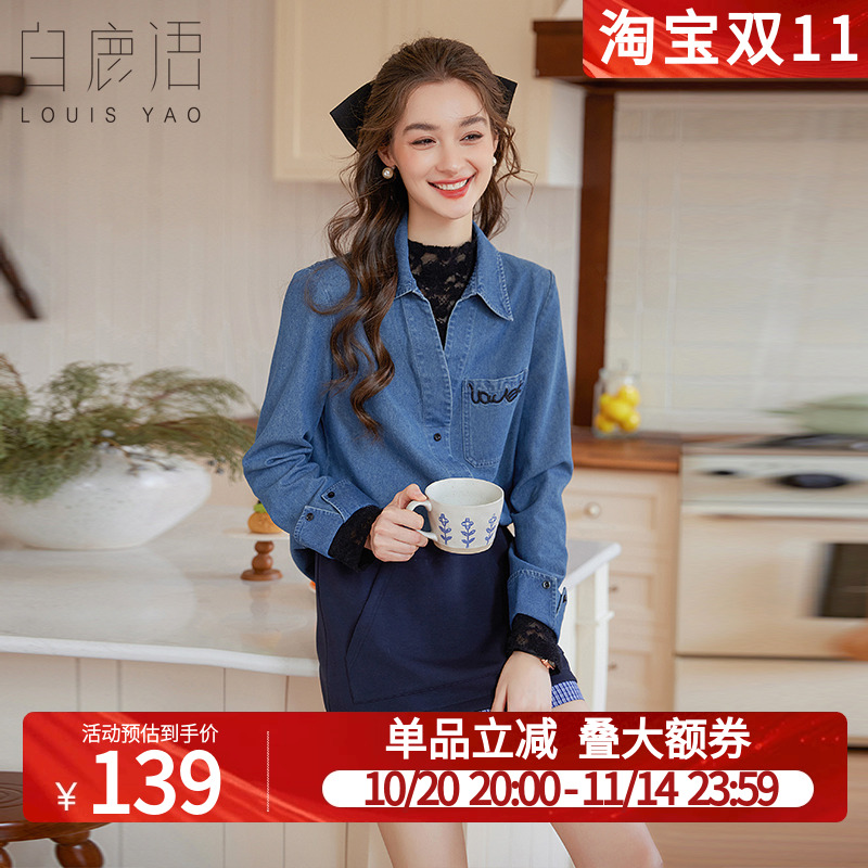 白鹿语时尚牛仔蓝色衬衣2025春新款镂空花边拼接蕾丝假两件衬衫女