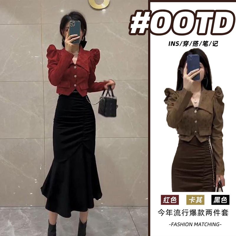 网红气质时尚套装女秋季新款法式泡泡袖纯欲风褶皱鱼尾裙两件套潮