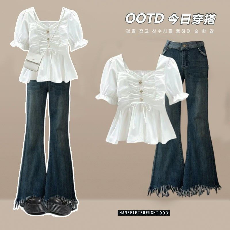 大码女装夏季套装女2025新款时尚褶皱短袖休闲百搭牛仔裤两件套潮