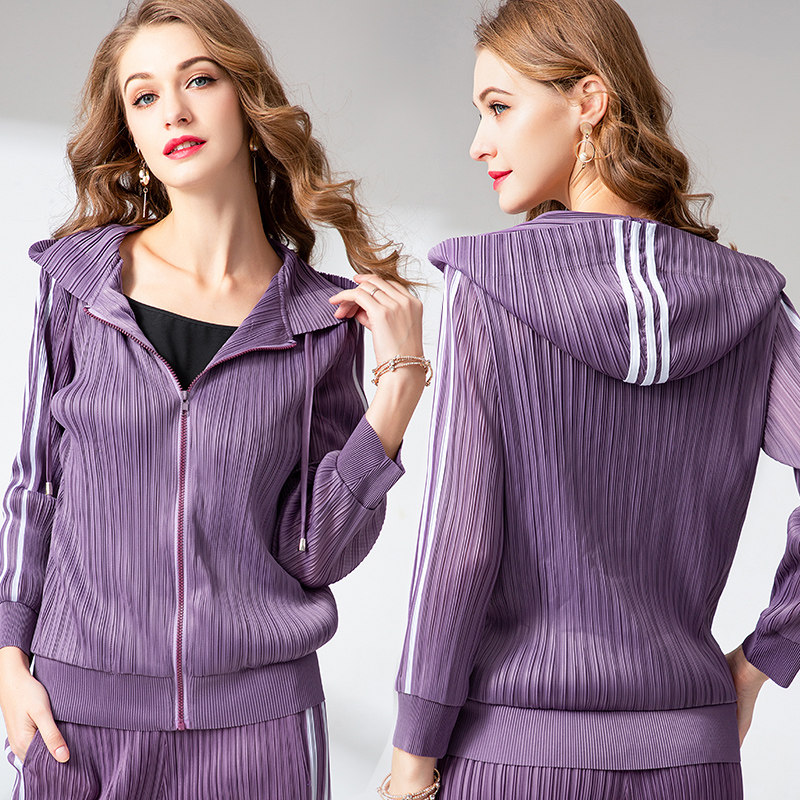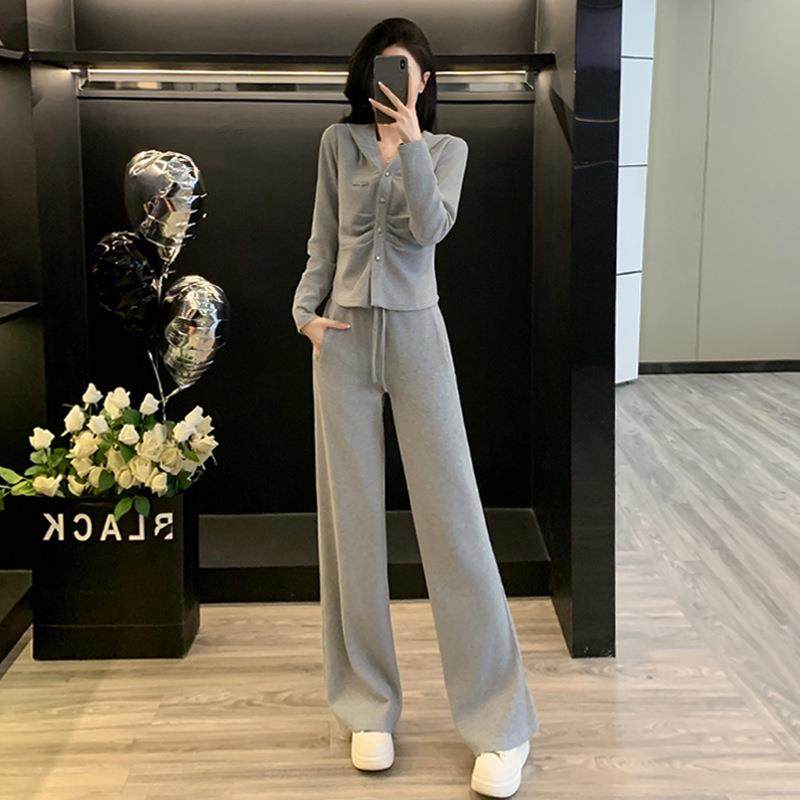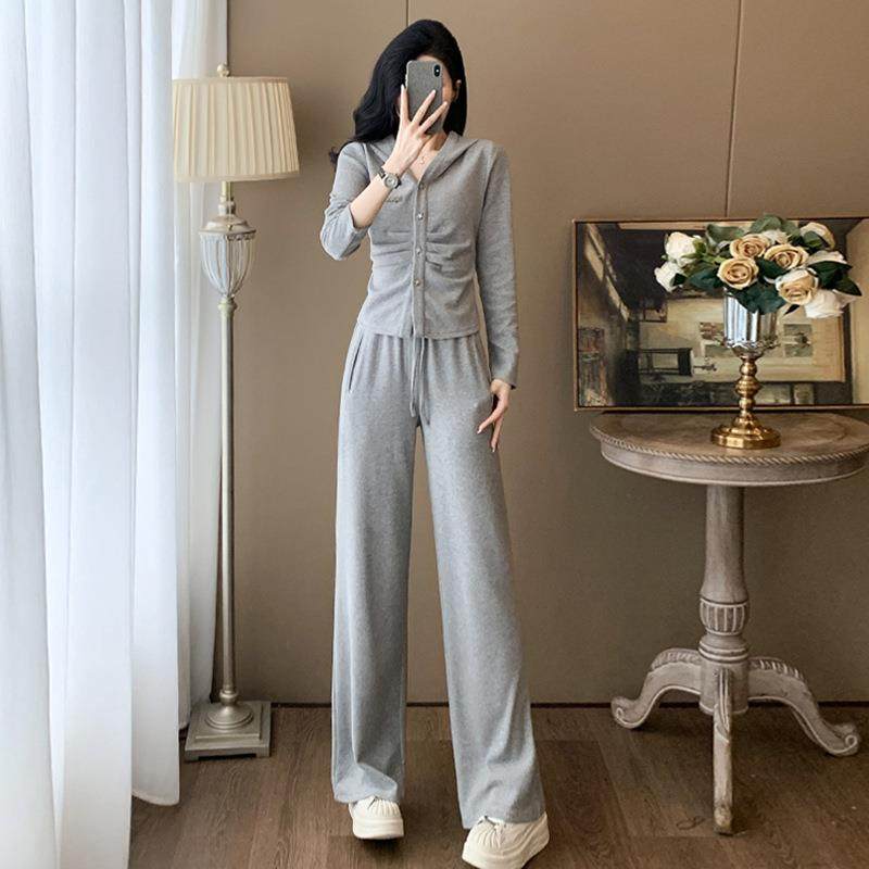 潮两件套阔腿裤套装连帽女时尚褶皱休闲开衫上衣新款秋季修身显瘦