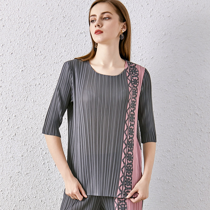中袖t恤女褶皱圆领侧边拼色弹力宽松套装衫中老年妈妈休闲上衣夏