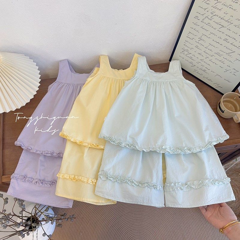 女童新款夏季时尚洋气三色褶皱花边无袖套装女宝宝休闲品质童装潮