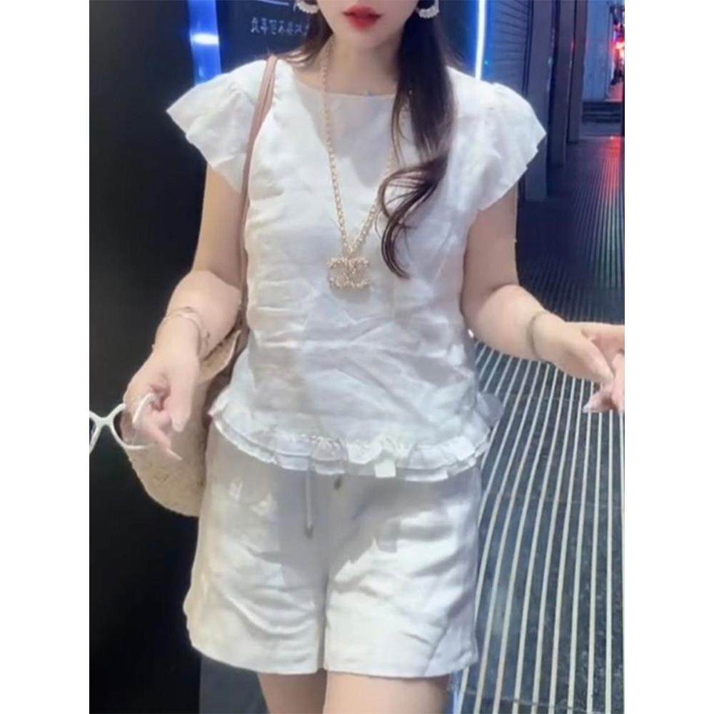 夏季新款薄款亚麻套装褶皱宽松显瘦时尚洋气飞飞袖小衫短裤两件套