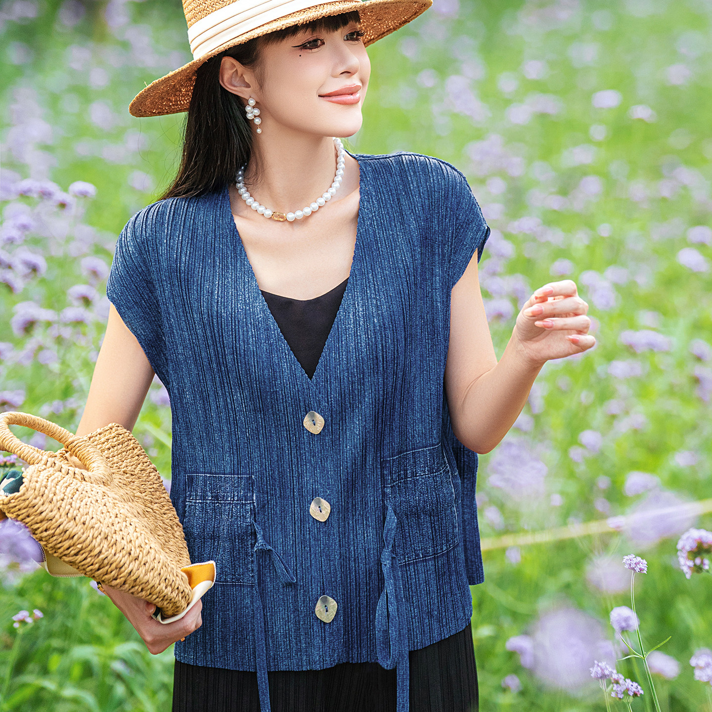 夏天马夹女式新款品牌2025套装贝壳扣外穿开衫褶皱假口袋抽绳马甲