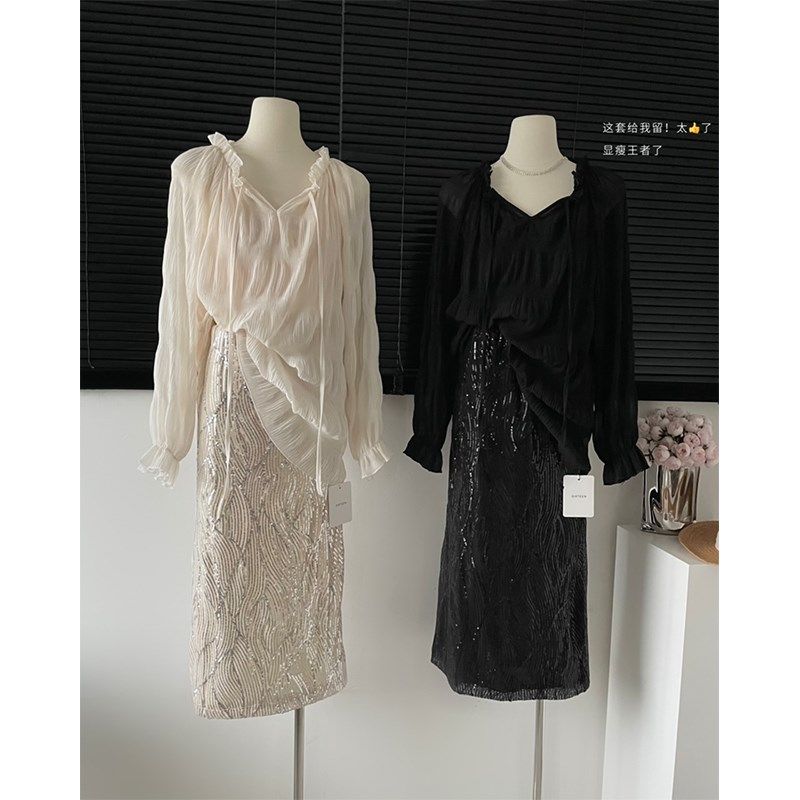 套装女2024秋季新款时尚褶皱系带衬衫上衣+亮片开衩半身裙潮
