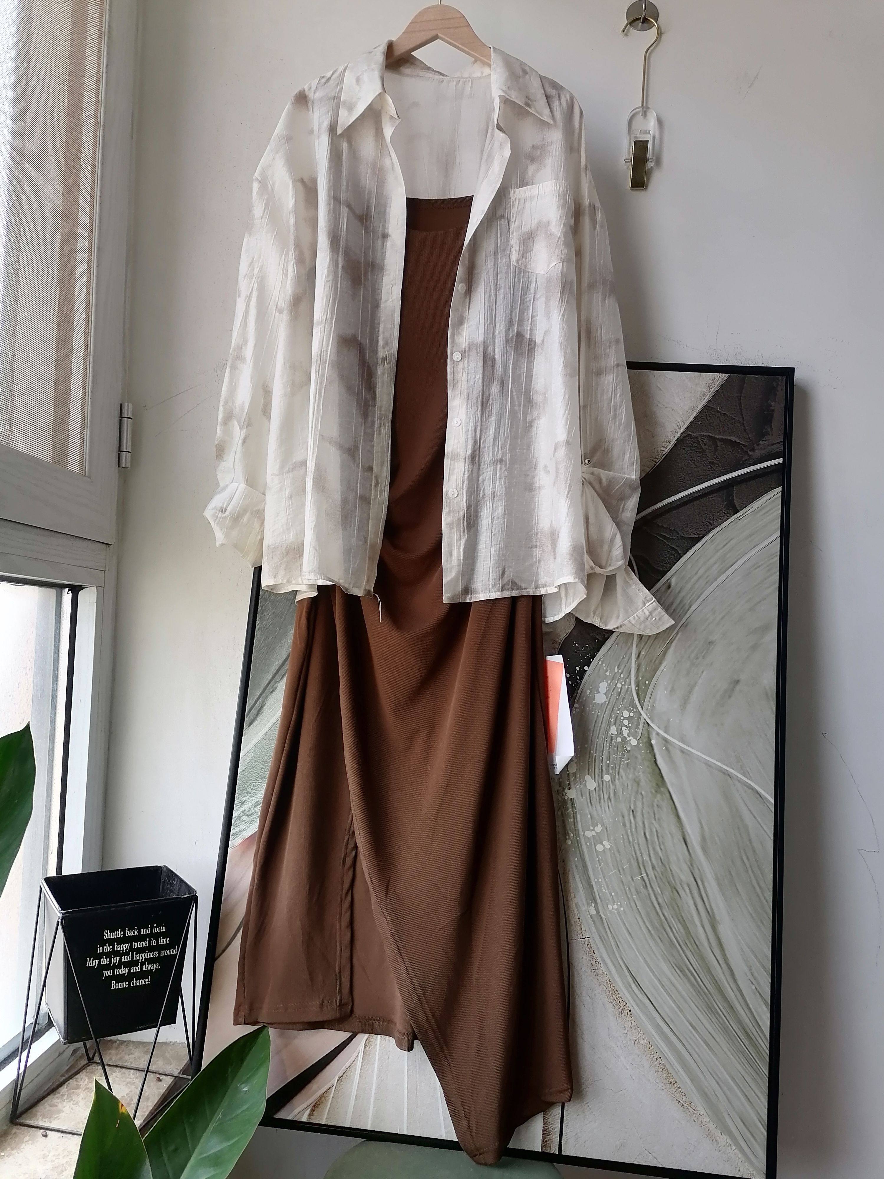 时尚休闲套装女春夏2024新长袖防晒衬衫褶皱收腰吊带连衣裙两件套