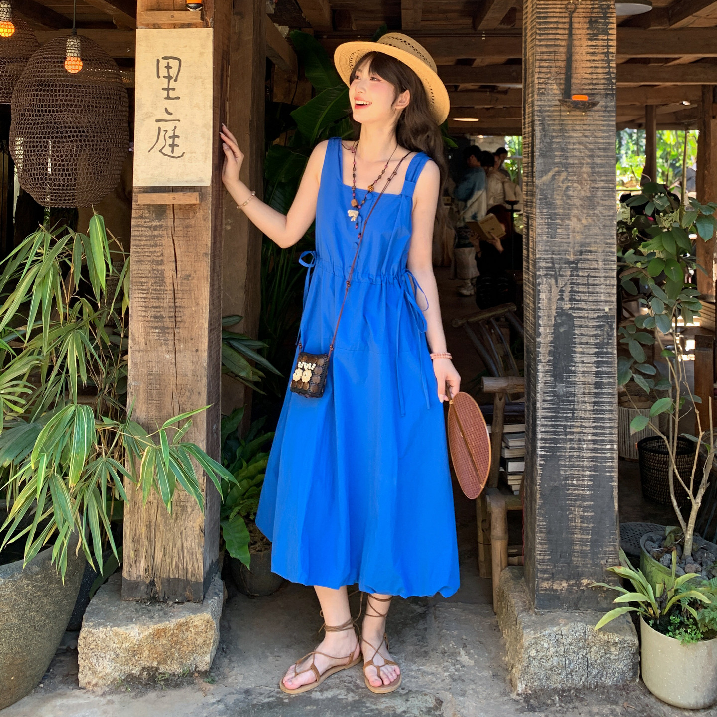 森女部落克莱因蓝显白慵懒度假无袖连衣裙女甜妹风纯棉收腰长裙夏