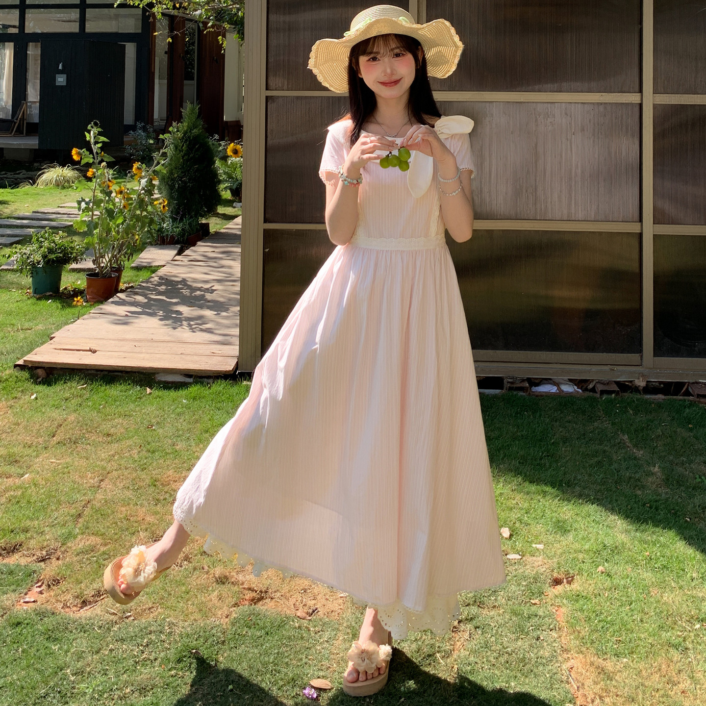 森女系原创想去海边 蕙质兰心 春日清楚系温柔淡粉色长裙连衣裙