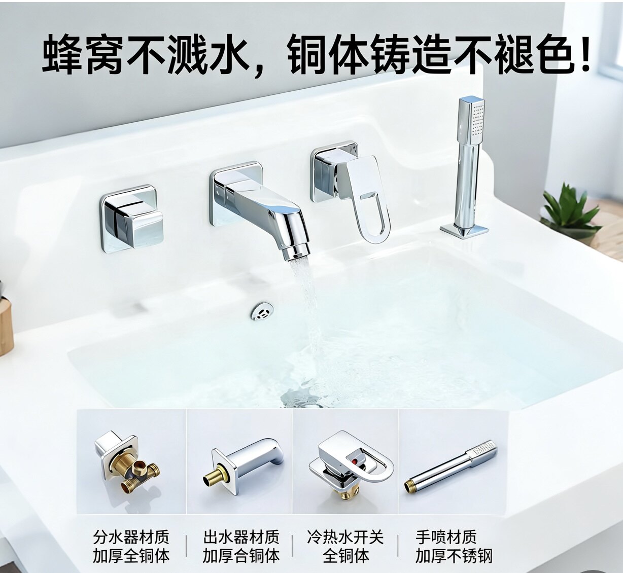 浴室柜面盆洗脸盆入墙式三孔冷热混水阀水龙头二三四件套开关全铜
