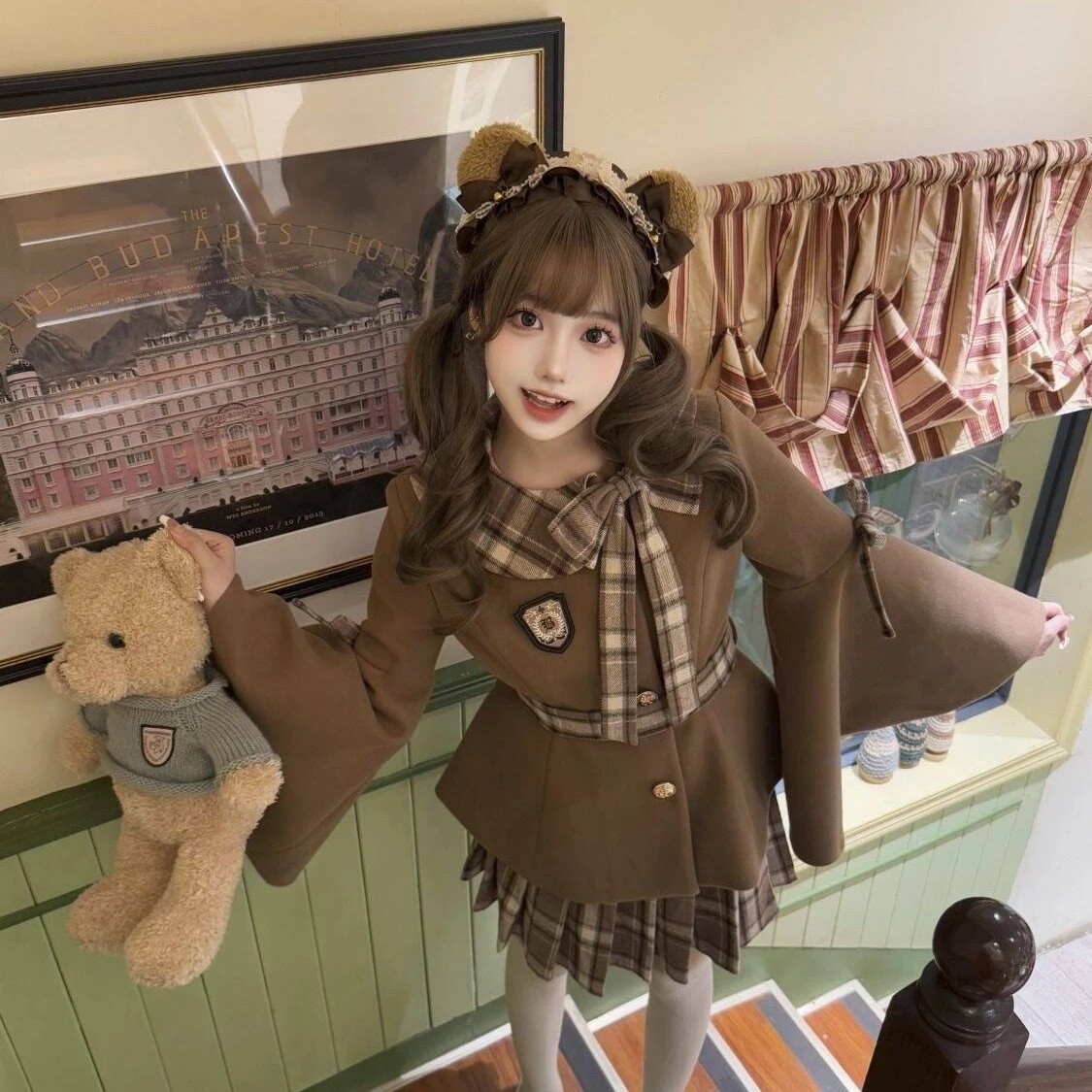 栗子海盐 春季新款学院风优雅千金感甜美少女外套格纹短裙两件套