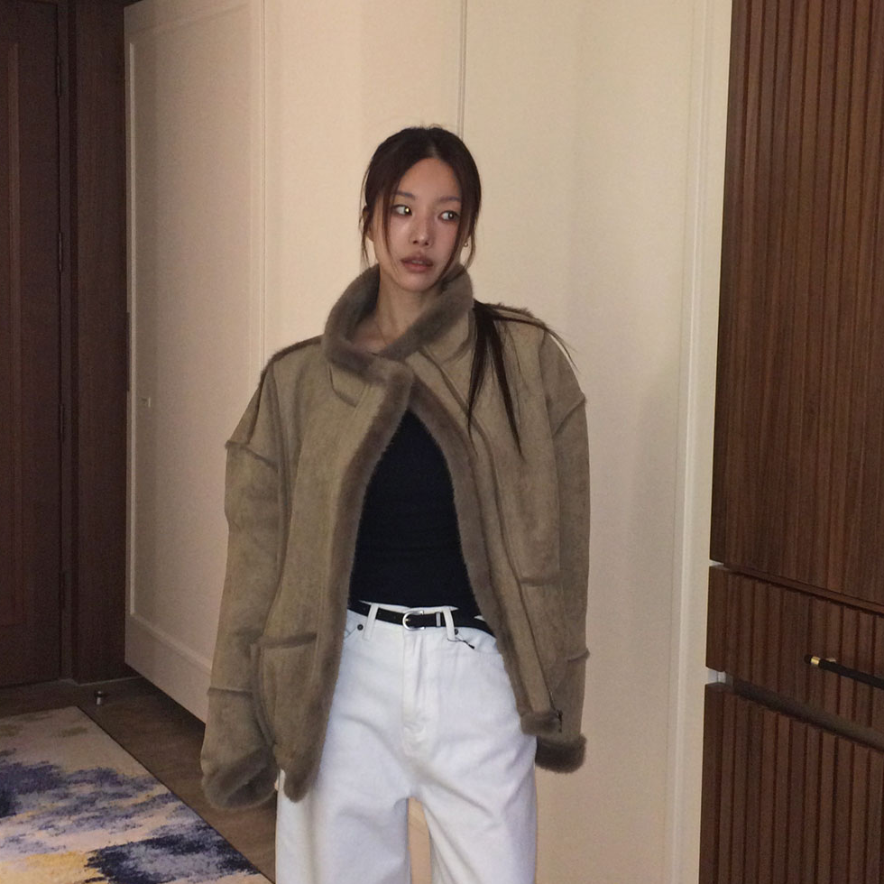 jijilulu积极璐 中古少女 翻领气质短外套温柔少女毛毛保暖显白