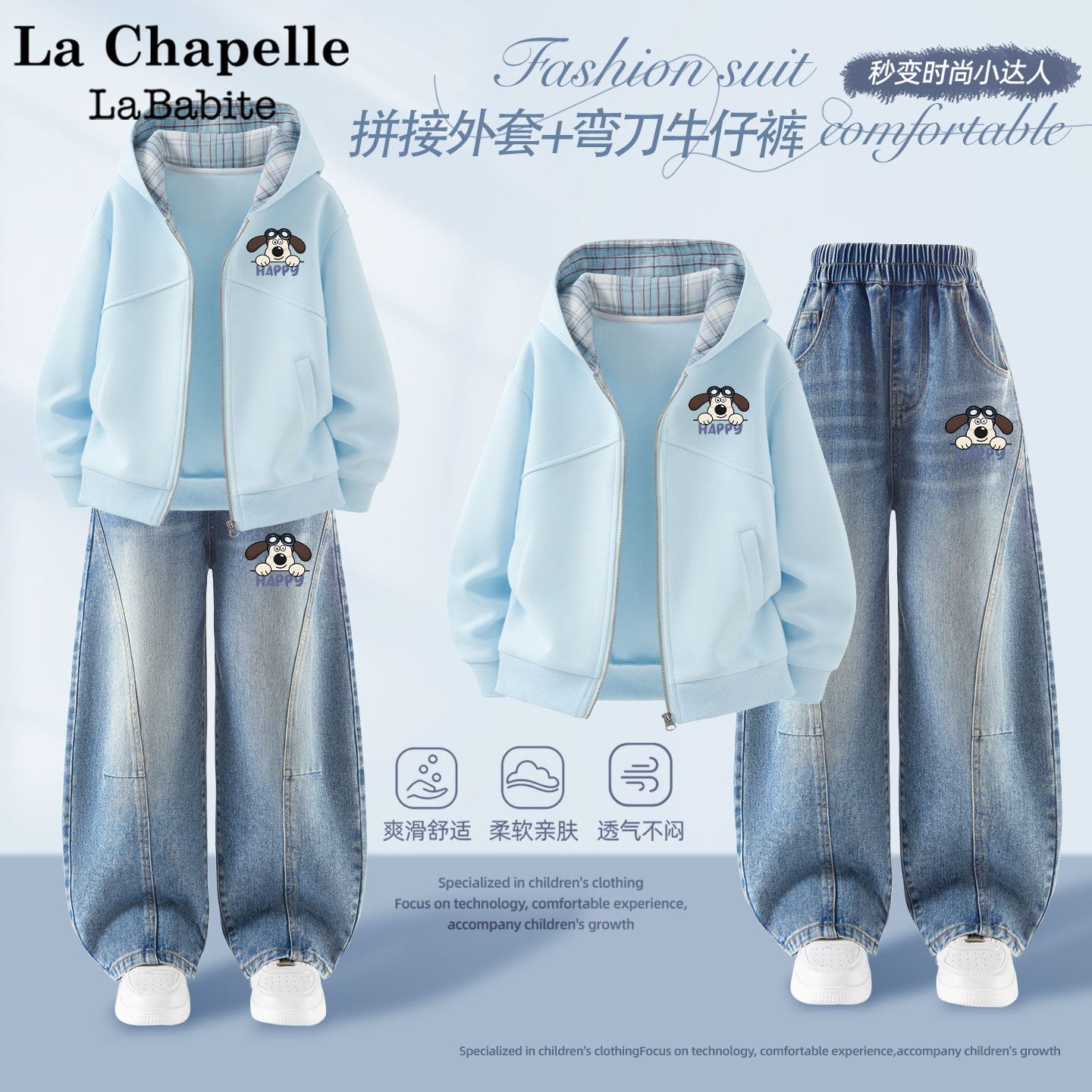 拉夏贝尔男童潮帅气时髦套装2026新款春装童装酷帅外套儿童牛仔裤