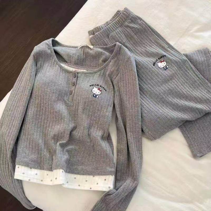 带胸垫睡衣女春秋季韩版撞色长袖长裤卡通休闲慵懒风可外穿家居服