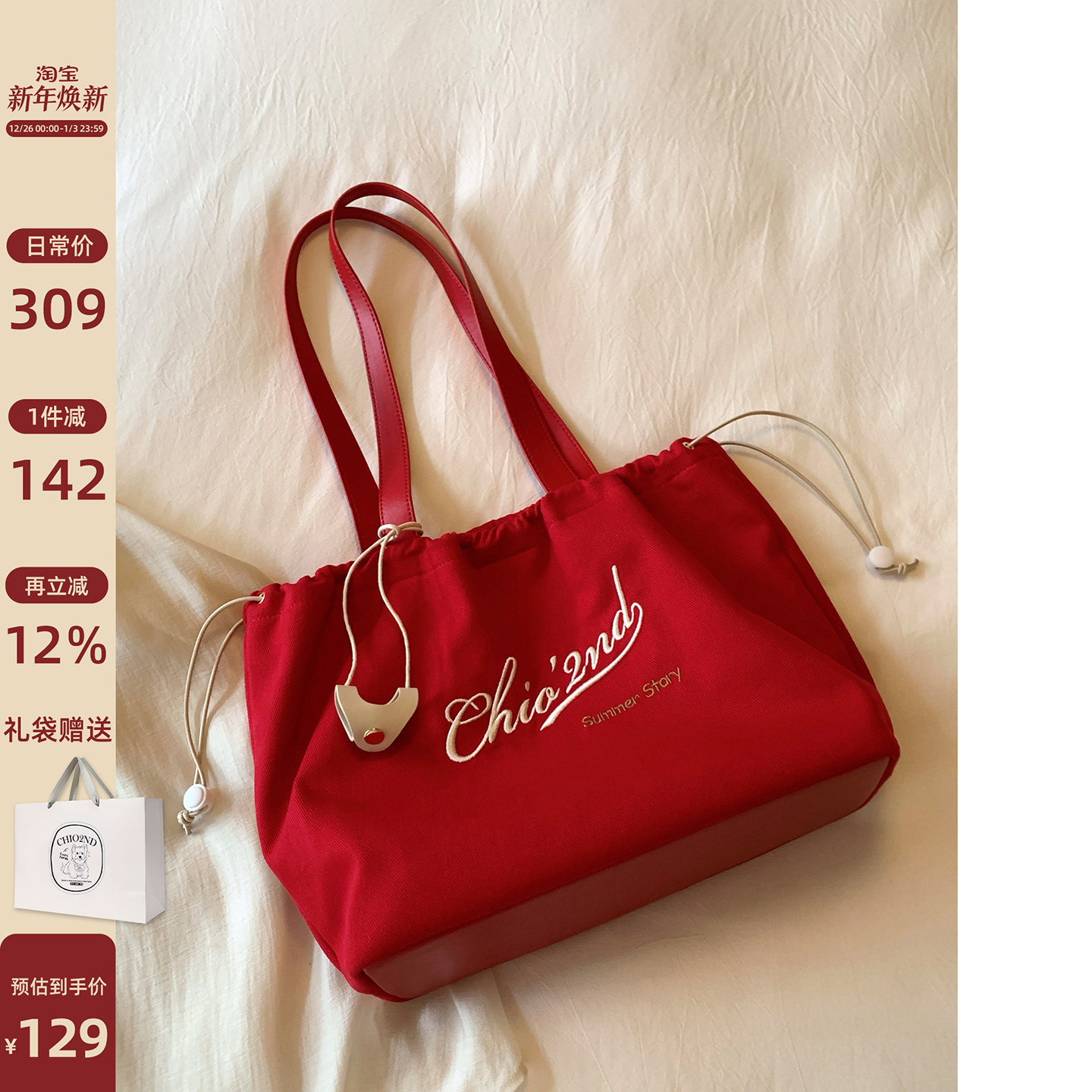 南风Chio2nd 元气日记托特包包女大容量红色帆布包通勤手提单肩包