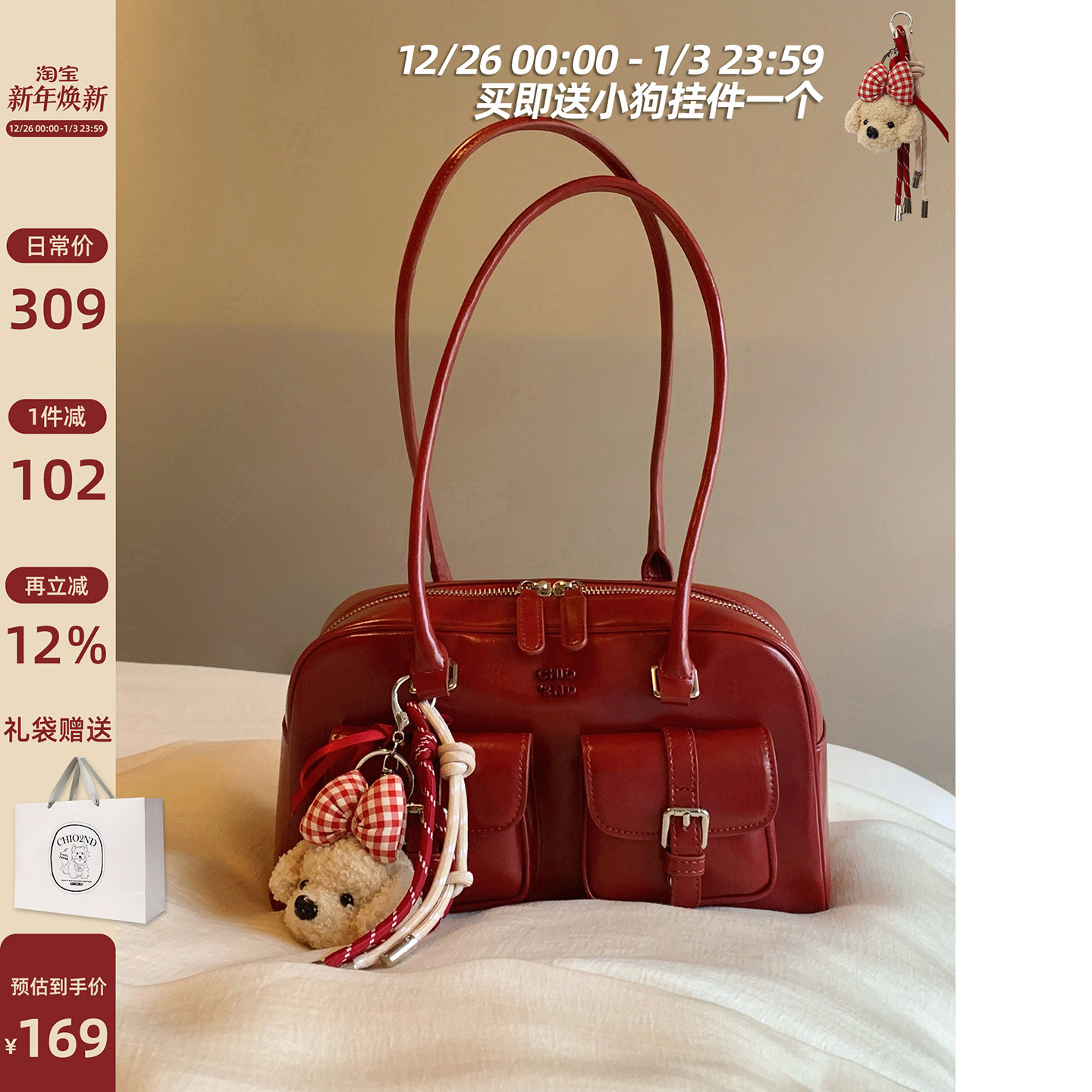 南风Chio2nd 桑巴酒廊枕头包包女红色复古波士顿手提包通勤单肩包