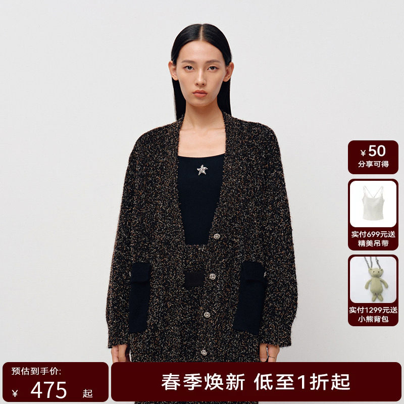 H·GENTEEL荷高25新款春装女宽松拼接毛织休闲金属扣气质针织衫