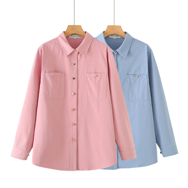 日系工装风双口袋长袖衬衫大码春装女宽松慵懒风水洗牛仔上衣外套