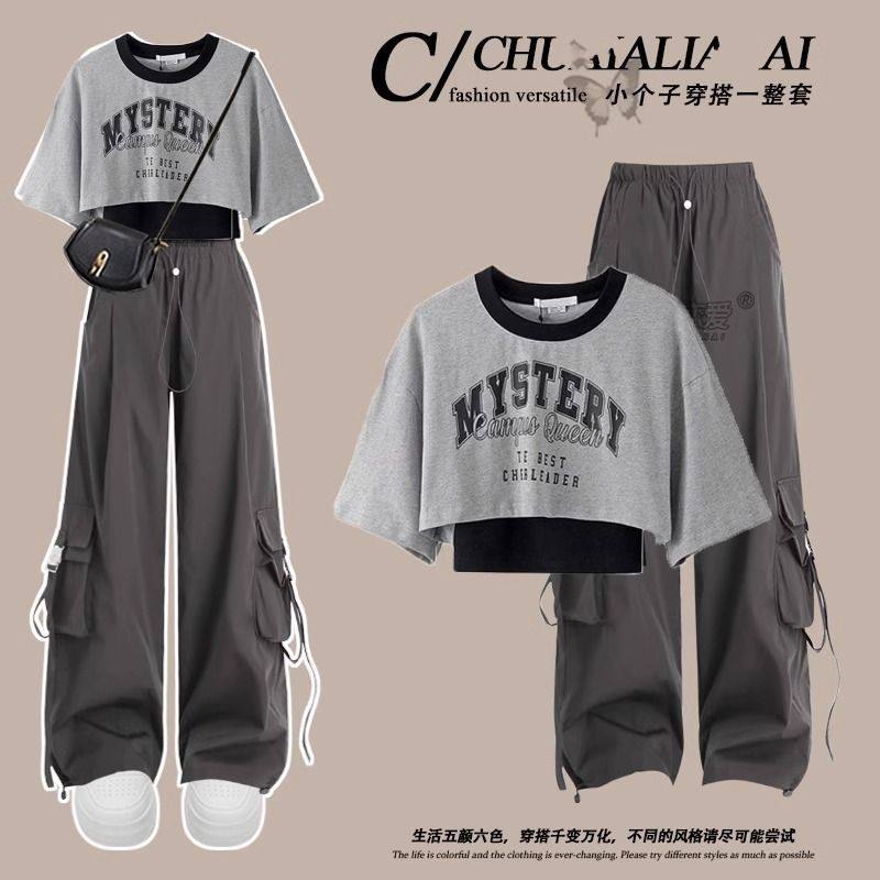 纯棉夏季工装裤套装女2025新款学生正肩短袖T恤初中生夏装阔腿裤