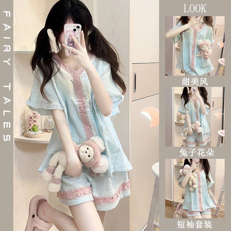 荷叶边短袖短裤套装女夏季新款甜美可爱拼色学生公主风薄款两件套