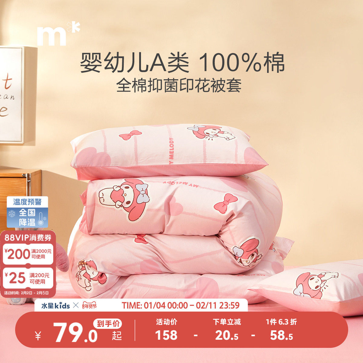 水星儿童纯棉被套单件婴幼儿A类抗菌全棉被罩美乐蒂宿舍床上用品