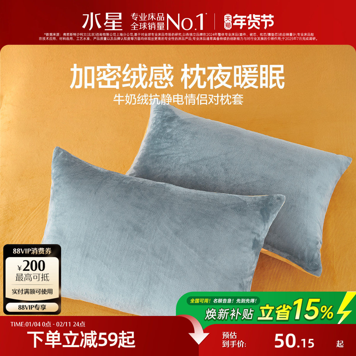 水星家纺暖绒枕套一对装抗静电牛奶绒枕头套秋冬保暖双人床上用品